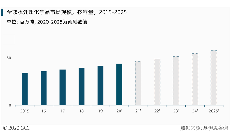 從全球水處理化學(xué)品市場看,過往5年增速穩(wěn)定,2019年全球需求量約4千萬噸,預(yù)計(jì)到2025年,全球收入將保持6%的CAGR成長。在市政行業(yè),全球城市及農(nóng)村對清潔用水尤其是飲用水的需求,將驅(qū)動(dòng)市政用水未來保持增長,而由于多國可利用水資源的短缺導(dǎo)致政府在推動(dòng)水循環(huán)利用方面的投資加大,也將促進(jìn)水處理化學(xué)品市場增長。