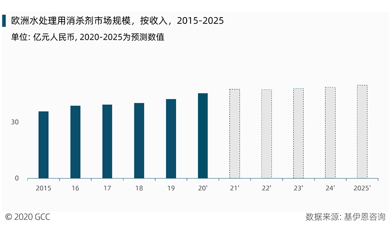 區(qū)域市場中,以歐洲為例進(jìn)行分析。西歐的水處理化學(xué)品需求量遠(yuǎn)高于東歐地區(qū)數(shù)倍,但從增速看,預(yù)計(jì)到2025年,東歐地區(qū)反而增速將快于西歐,主要得益于東歐存量市場及新增容量市場雙重需求驅(qū)動(dòng),西歐則以存量市場更新為主。從類別看,2019年歐洲僅消毒和殺菌類水處理化學(xué)品市場規(guī)模就已經(jīng)過30億元人民幣,相比于阻垢劑、抗腐蝕劑、絮凝劑等歐洲用量較大的產(chǎn)品,市場規(guī)模相對較小的殺菌類水處理化學(xué)品市場增速預(yù)期將繼續(xù)保持較低速成長。