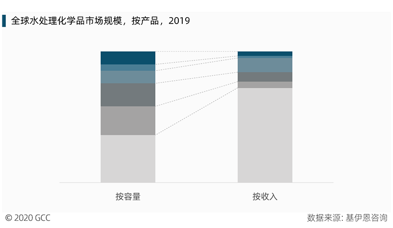 如前文所述,水處理化學(xué)品有諸多分類,由于不同種類產(chǎn)品的價(jià)格差異較大,導(dǎo)致分類市場中,容量市場占比與收入市場占比差距較大,像絮凝劑、pH調(diào)節(jié)劑價(jià)格相對便宜,而消泡劑、阻垢劑、緩蝕劑等價(jià)格相對較貴。絮凝劑得益于膜過濾技術(shù)的普及使用、pH調(diào)節(jié)劑得益于其越來越廣泛地用于調(diào)節(jié)地下水的pH值,消泡劑是某些工業(yè)水處理工藝過程中的必需品,將得益于全球工業(yè)領(lǐng)域的擴(kuò)張,不同分類產(chǎn)品在預(yù)測期內(nèi),增速各異,詳見完整報(bào)告。