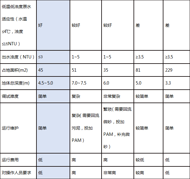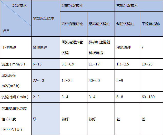 傘型沉淀技術(shù)與其它沉淀技術(shù)對(duì)比表(以1萬噸/天規(guī)模水廠為例)